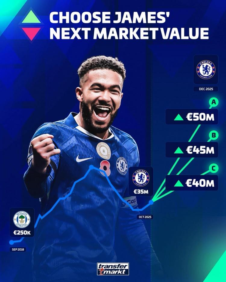 虎撲11月27日訊 據德國轉會(huì )市場(chǎng)官方消息,將在12月9日更新英超球員的轉預身價(jià)。而今日,熱里德轉官方社媒曬出圖片,板德預熱切爾西隊長(cháng)里斯-詹姆斯的轉預身價(jià)變化。