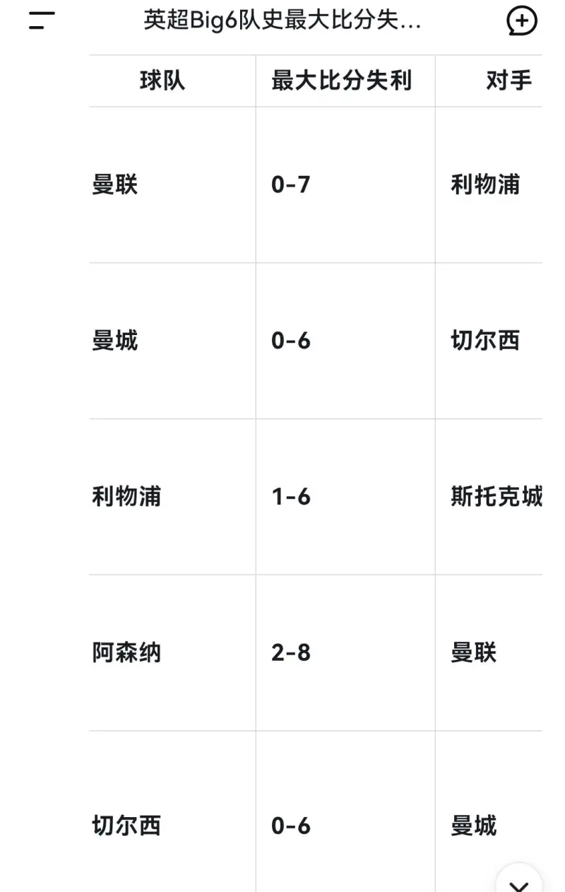 娜迷提到上賽季曼城1:5輸給阿森納是曼城隊史big6內戰最大比分失利的比賽。我就用Deepseek查了一下,比賽還是英超娜娜的2:8最耀眼!曼城和切爾西算是賽場(chǎng)史最禮尚往來(lái)了