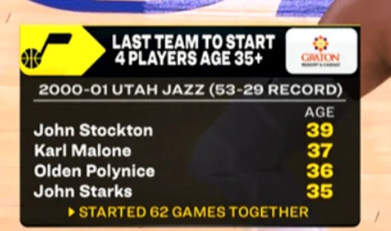 比賽現場(chǎng)給出字幕,NBA比賽上一次出現4名首發(fā)球員達到35+歲的球隊是2000-01賽季的爵士,當時(shí)他們的首發(fā)陣容中約翰-斯托克頓39歲,卡爾-馬龍37歲,奧爾登-波利尼斯36歲和約翰-斯塔克斯35歲。