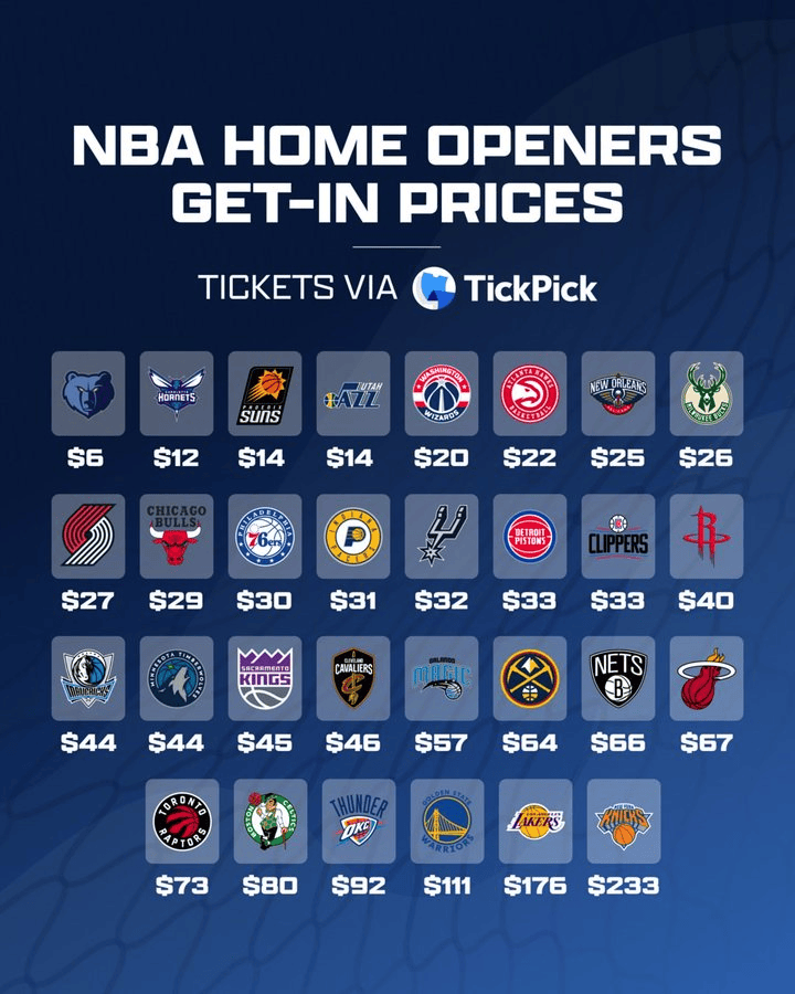 線(xiàn)上購票網(wǎng)站TickPick公布了各隊新賽季主場(chǎng)首戰的主場(chǎng)入場(chǎng)票價(jià)(最低票價(jià)):