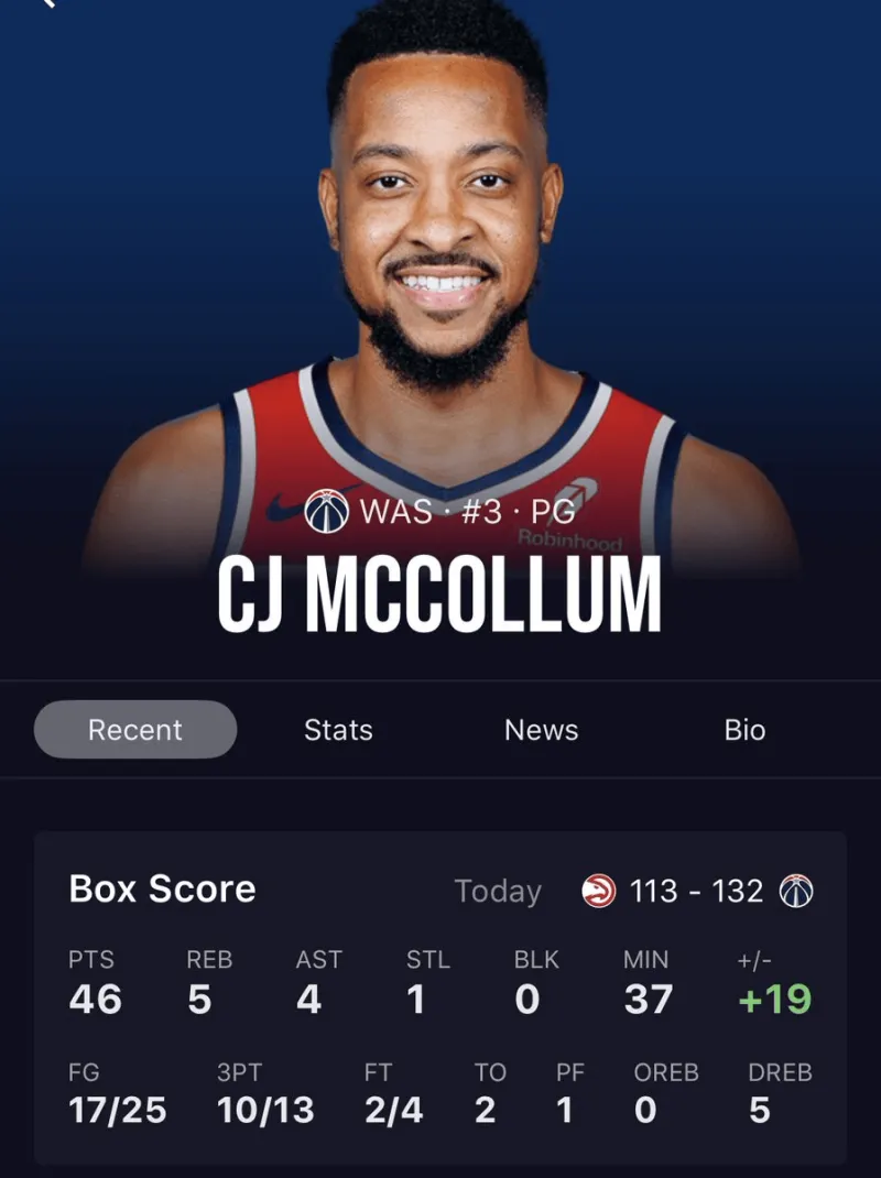 本場(chǎng)比賽,奇才后衛CJ-麥科勒姆發(fā)揮出色,拿到46分5籃板4助攻。