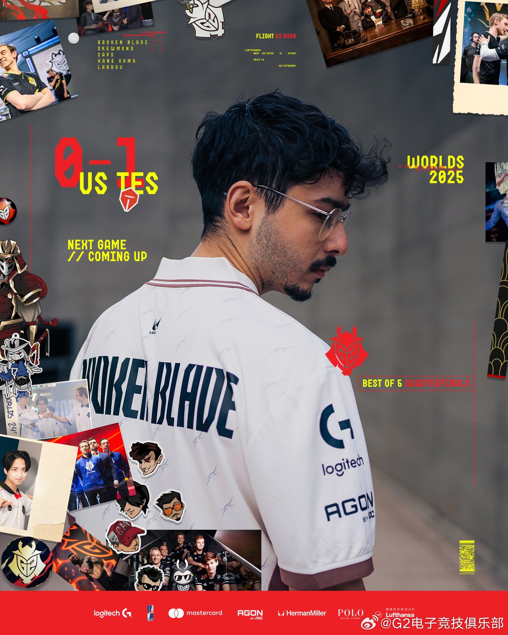 虎撲10月30日訊 2025全球總決賽八強賽,G2首局不敵TES,板首G2在第一局賽后發(fā)文: