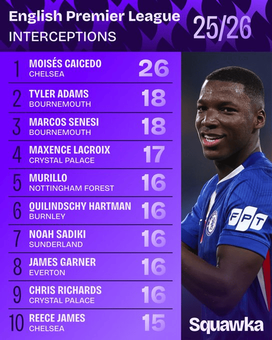[流言板]英超本賽季攔截榜:凱塞多26次斷檔領(lǐng)先,亞當斯&塞內西次席