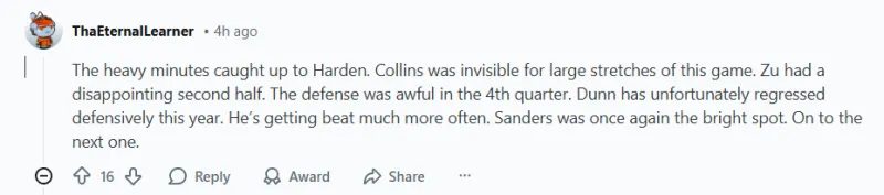 -(16贊)哈登的上場(chǎng)時(shí)間太長(cháng)了??屏炙乖诒緢?chǎng)比賽的大部分時(shí)間里都處于隱形狀態(tài)。祖巴茨下半場(chǎng)的表現令人失望。第四節的防守非常糟糕。鄧恩今年在防守上不幸退步了。他被針對得更頻繁了。桑德斯再次成為亮點(diǎn)。下一場(chǎng)