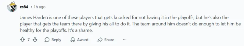 -詹姆斯-哈登就是這樣一位因為在季后賽中表現不佳而遭到抨擊的球員,但他也是通過(guò)全力以赴讓球隊打進(jìn)季后賽的球員。他身邊的團隊沒(méi)有做足夠的努力,讓他在季后賽中保持健康。這是一個(gè)遺憾。