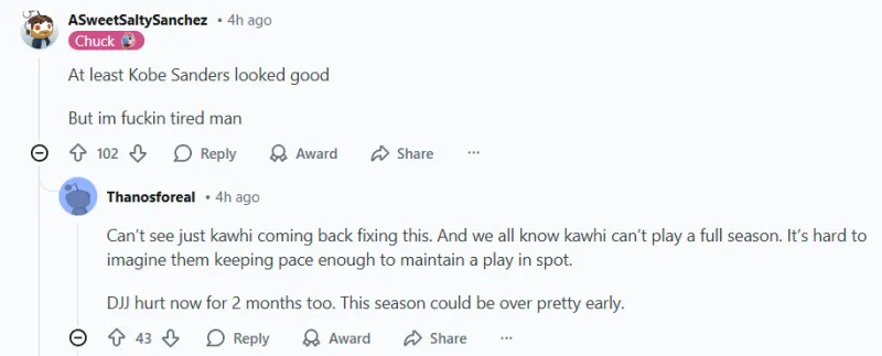-(43贊)光靠卡哇伊一個(gè)人是無(wú)法解決這個(gè)問(wèn)題的。我們都知道卡哇伊不可能打滿(mǎn)整個(gè)賽季。很難想象他們能保持足夠的速度來(lái)維持一個(gè)出場(chǎng)位置。