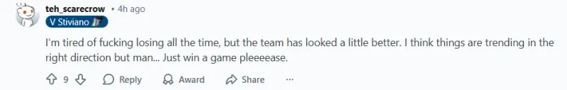 -我已經(jīng)厭倦了總是輸球,但球隊的表現看起來(lái)好多了。我覺(jué)得事情正朝著(zhù)正確的方向發(fā)展,但老兄... 贏(yíng)一場(chǎng)比賽吧
