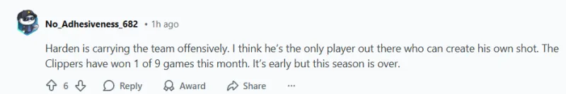 -哈登是球隊進(jìn)攻的扛把子。我認為他是場(chǎng)上唯一能自己創(chuàng )造投籃機會(huì )的球員??齑驹?戰1勝。雖然為時(shí)尚早,但本賽季已經(jīng)結束了。