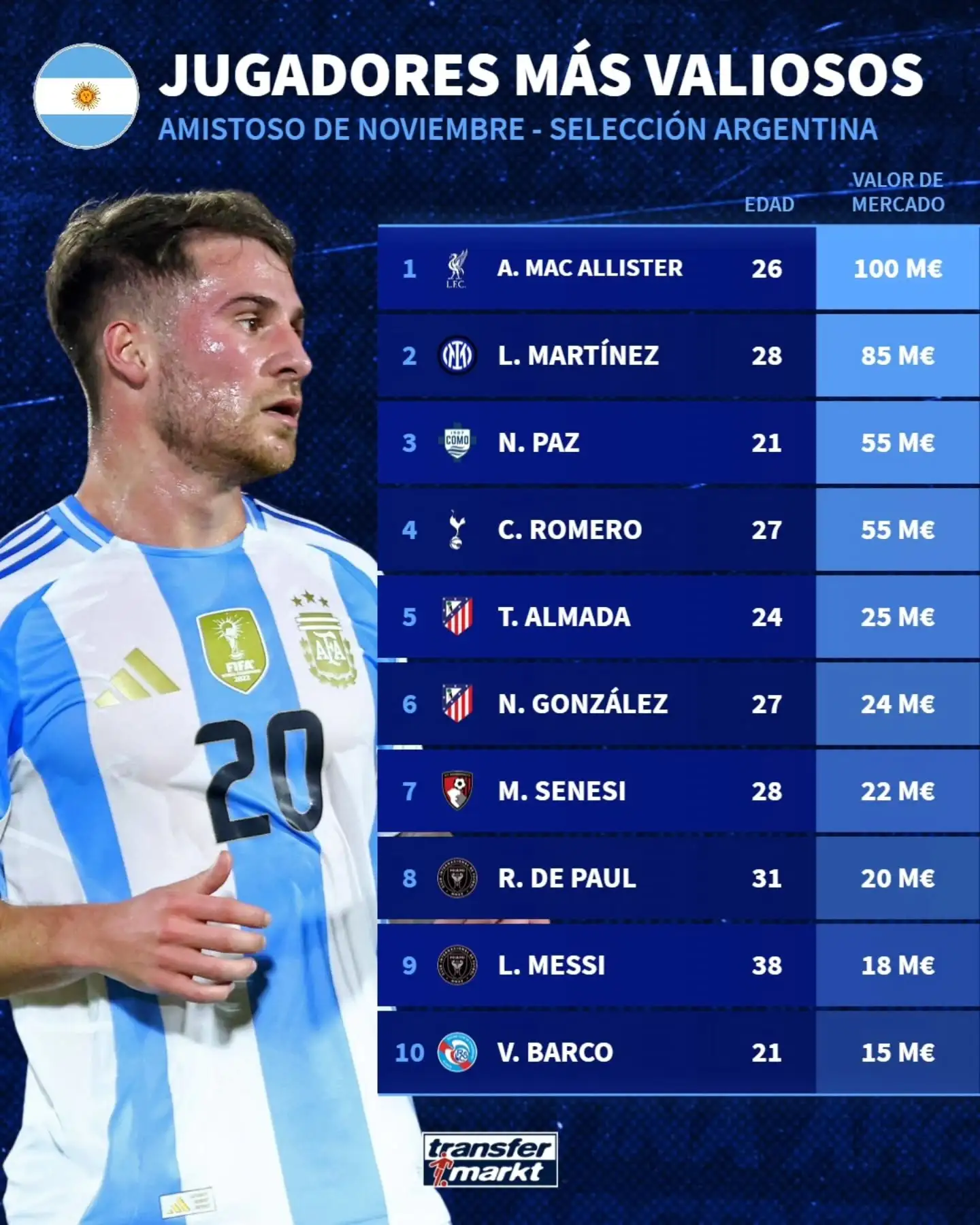 虎撲11月16日訊 德國轉會(huì )市場(chǎng)統計了本月入選阿根廷國家隊的球員身價(jià),排名前十的根廷國腳情況如下:
