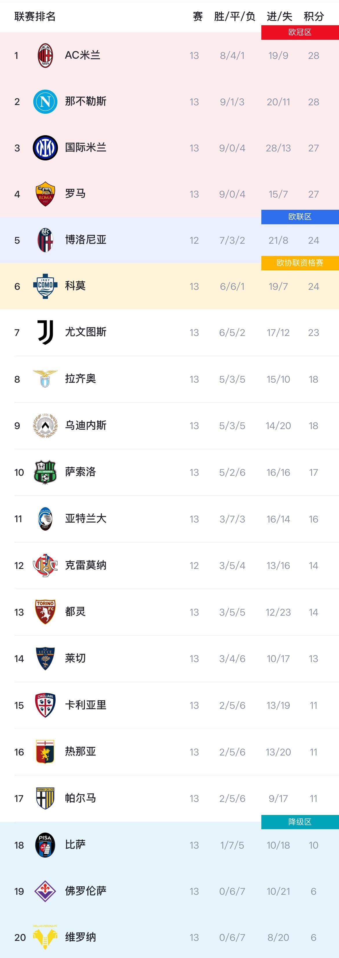 尤文圖斯主場(chǎng)2比1戰勝卡利亞里,繼續穩居歐戰區;科莫2比0擊敗薩索洛后,上升到第六位。亞特蘭大2比0戰勝佛羅倫薩,熱那亞2比1力克維羅納,雙雙拿到關(guān)鍵保級分。最新積分榜中,倒數三位分別是比薩、佛羅倫薩和維羅納,而博洛尼亞少賽一場(chǎng),依然以24分占據第五名。