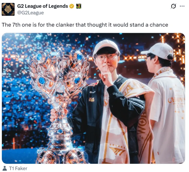 虎撲11月26日訊 昨日馬斯克想要嘗試Ai人工智能能否在2026年擊敗英雄聯(lián)盟最佳人類(lèi)戰隊,對此G2官方為Faker應援,己有機配文如下: