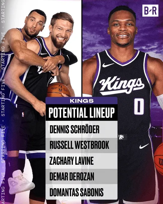 美媒Bleacher Report更新動(dòng)態(tài),國王曬出了威少加盟后的海報潛在首發(fā)陣容:施羅德、威少、預測拉文、下國德羅贊和小薩。場(chǎng)數