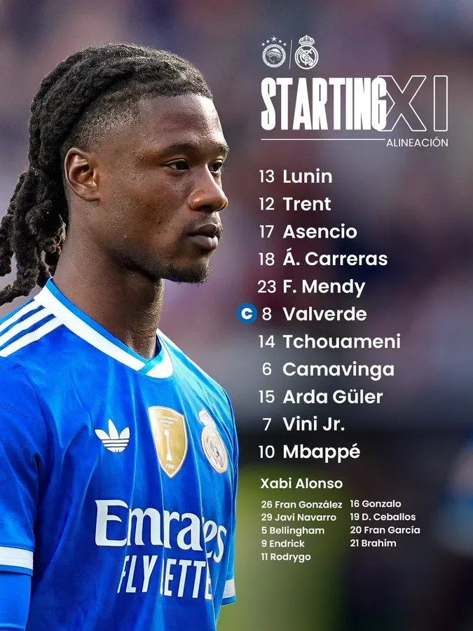 替補:26-弗蘭-岡薩雷斯、16-貢薩洛、29-納瓦羅、19-塞巴略斯、5-貝林厄姆、20-弗蘭-加西亞、9-恩德里克、21-迪亞斯、11-羅德里戈