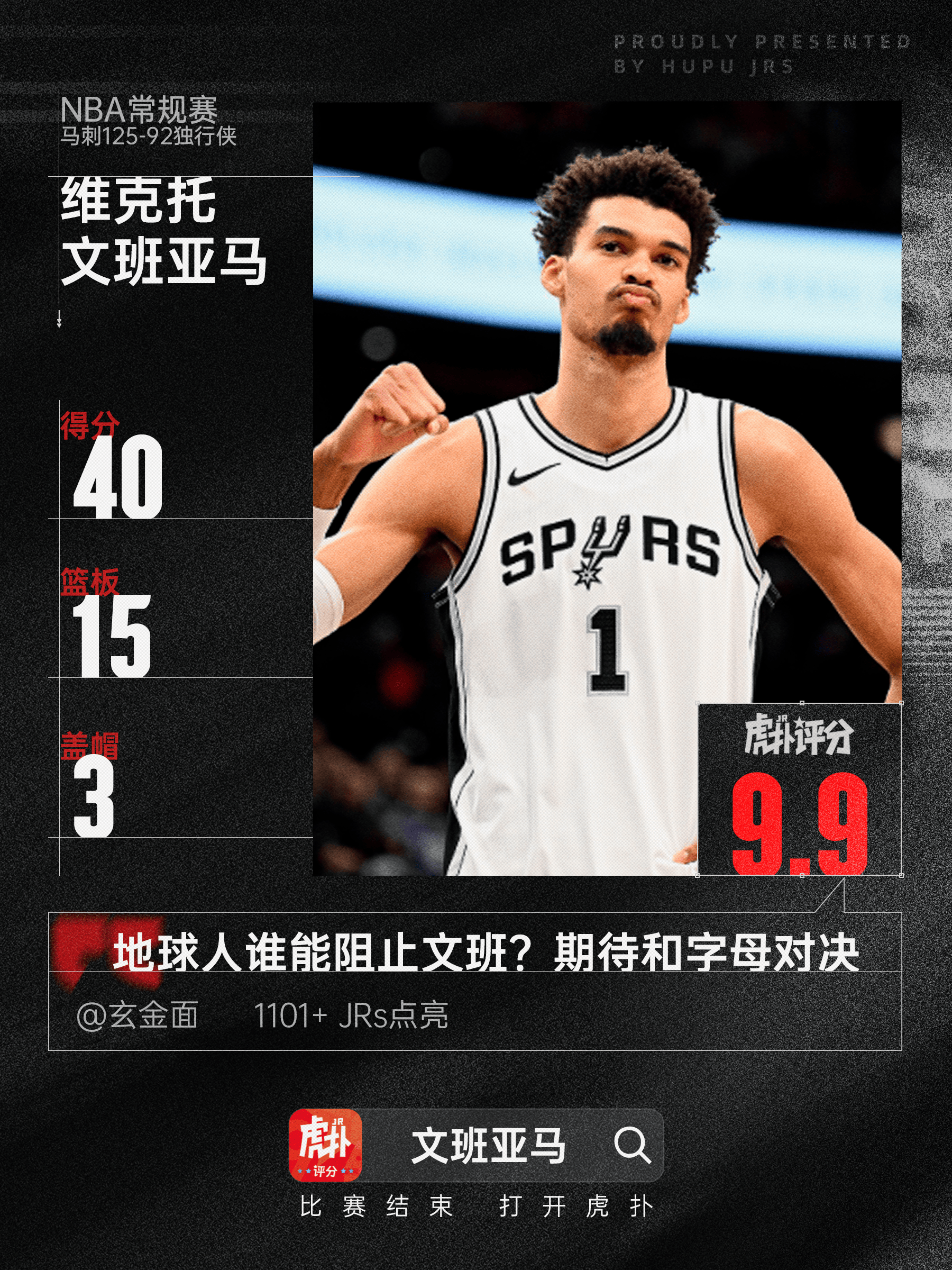 本場(chǎng)比賽,砍下馬刺球員維克托-文班亞馬出戰29分鐘,分籃21投15中,板封其中三分球2投1中,蓋失罰球11投9中,圣僧得到40分15籃板1助攻1搶斷3封蓋。無(wú)解文班誤