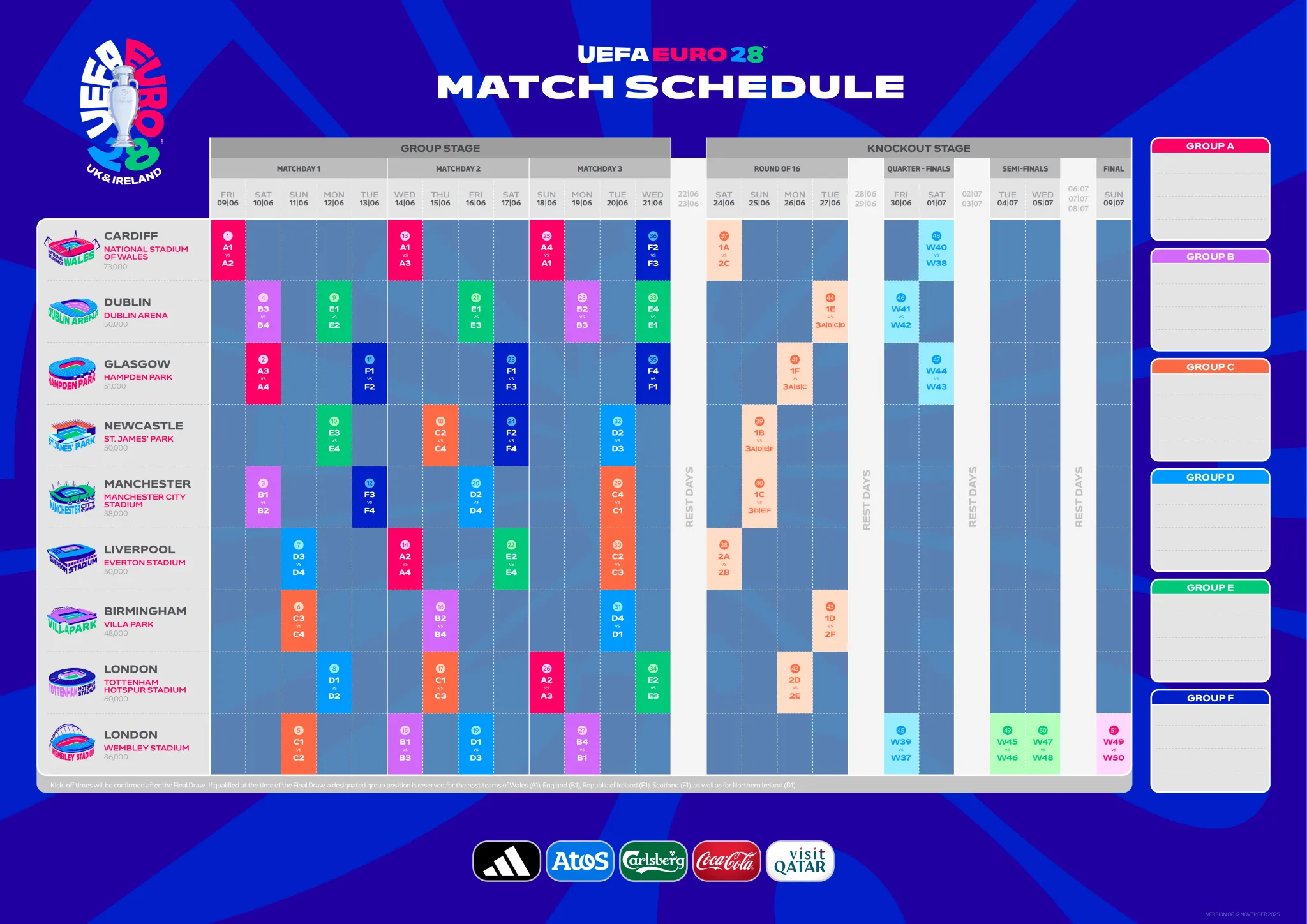 揭幕戰:2028年6月9日(周五)在卡迪夫國家體育場(chǎng)舉行。