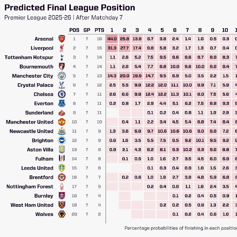 來(lái)源:X虎撲10月15日訊 數據網(wǎng)站Opta更新了本賽季英超的奪冠概率。目前本賽季英超已經(jīng)結束了前7輪比賽。森納