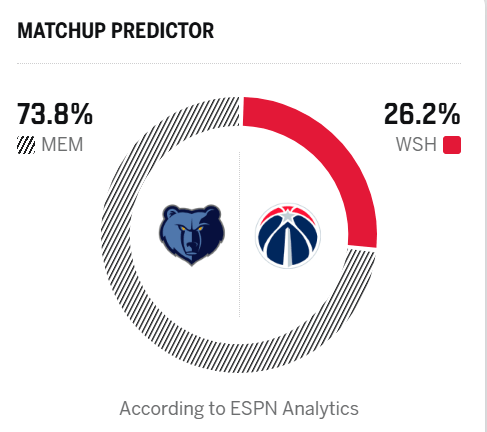 賽前,日比美媒ESPN預測本場(chǎng)比賽,賽灰灰熊勝率73.8%,熊勝奇才勝率26.2%。