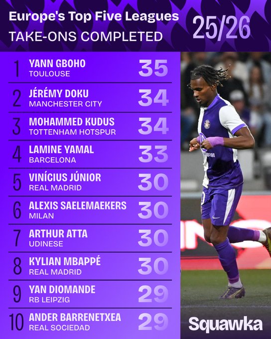 虎撲11月21日訊 Squawka數據統計本賽季至今五大聯(lián)賽過(guò)人榜,圖盧茲球員格博霍第一,爾列多庫、流言列第庫杜斯并列第二。板本