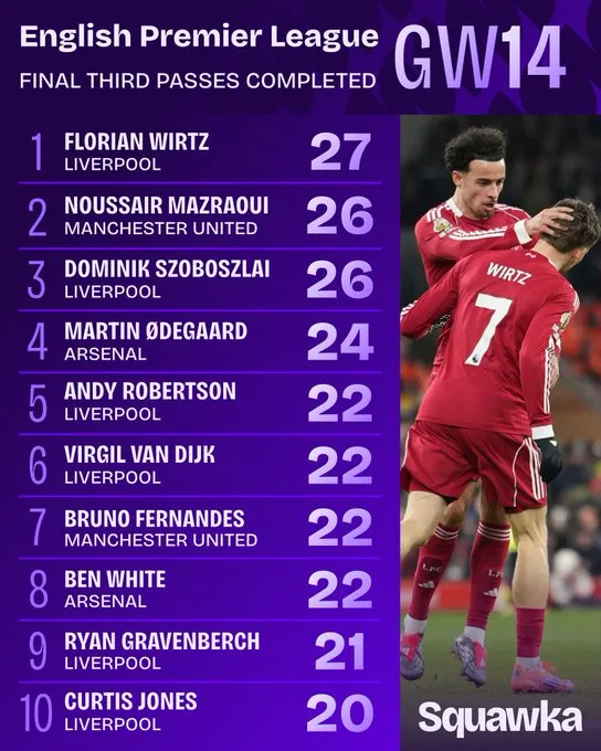 虎撲12月05日訊 Squawka數據統計,維爾茨是維爾完成英超第14輪進(jìn)攻三區完成傳球次數最多的球員,共27次。茨英超第傳球次數