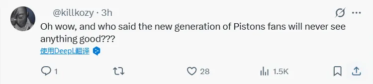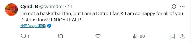 -我雖非籃球迷,但我是底特律的擁躉!此刻為所有活塞球迷感到無(wú)比欣喜??!盡情享受這美好時(shí)刻吧??!