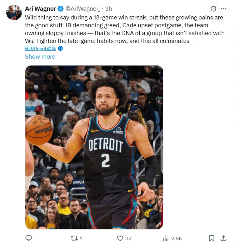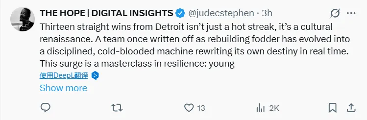 -(13贊)底特律豪取十三連勝,這不僅是狀態(tài)火熱,更是一場(chǎng)文化復興。這支曾被視為重建炮灰的隊伍,如今已蛻變?yōu)榧o律嚴明、冷酷無(wú)情的機器,正在實(shí)時(shí)改寫(xiě)自己的命運。這波強勢表現堪稱(chēng)韌性典范:年輕