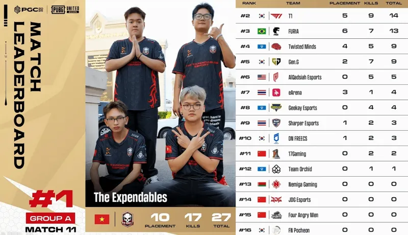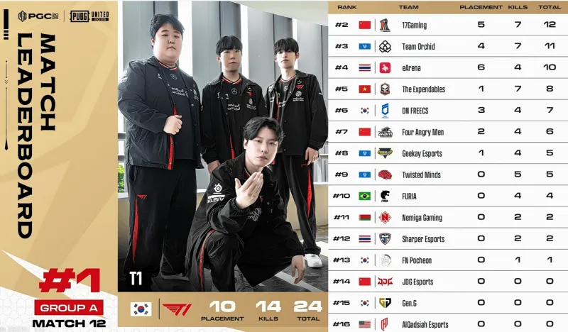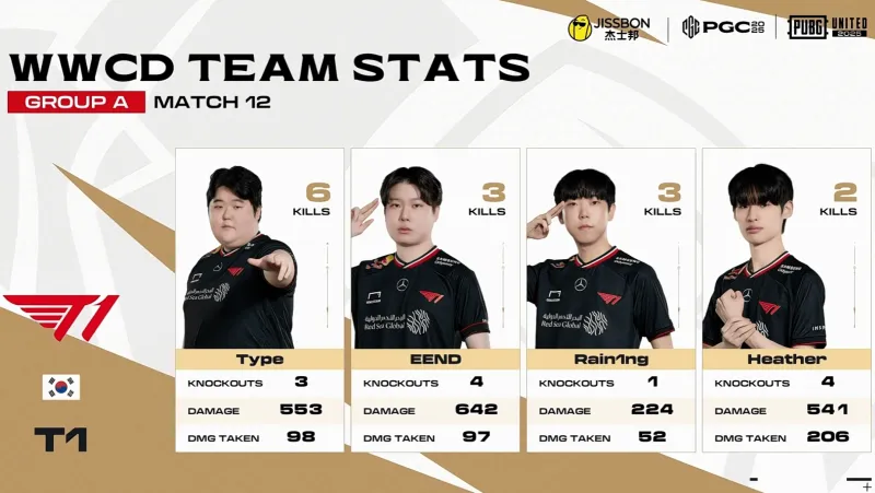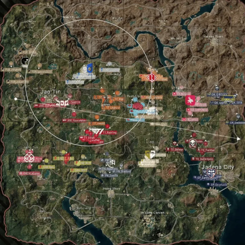 階段8,TE控制優(yōu)勢區域,打掉FUR一人,隨后T1也被FUR打掉一人,TE兩側出擊,全滅T1和FUR,17淘汰吃雞。