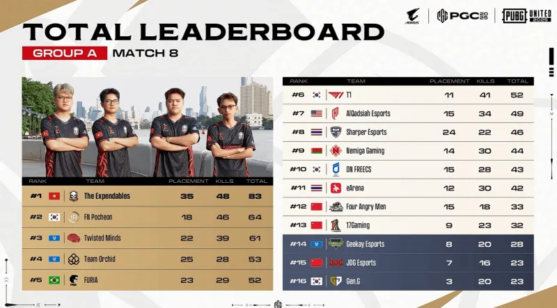 階段8,TE被FUR和ORCH夾擊淘汰,SP也被FUR和ORCH夾擊淘汰。決賽圈FUR 4V3 ORCH,FUR四人同時(shí)進(jìn)攻ORCH前點(diǎn)一人,隨后ORCH打倒2人,但FUR再度打倒一人,決賽圈2V1,ORCH獨狼打掉1人后被淘汰。