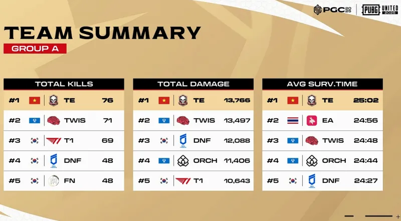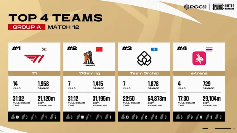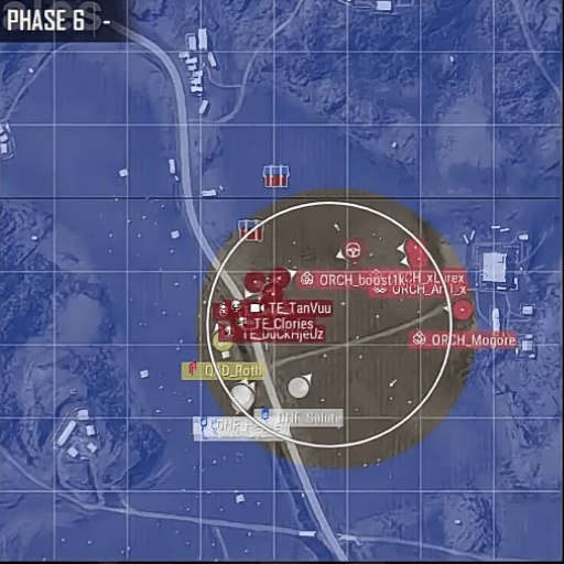 階段8,TE 4V4 ORCH,后者占據地形優(yōu)勢,TanVuu再度98K打倒ORCH一人,與此同時(shí)側翼的clories也打掉一人后被放倒,3V2,TE前點(diǎn)突破與對手完成1換1,最終剩余2人完成吃雞。