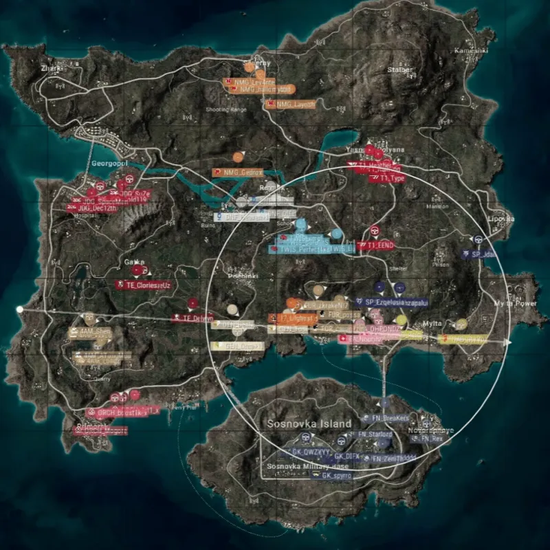 本局決賽圈位于卡車(chē)旅館東南側T字路口附近。