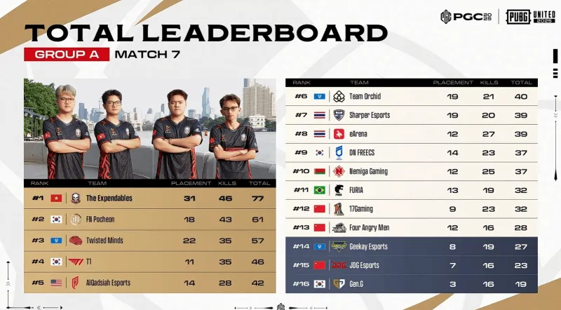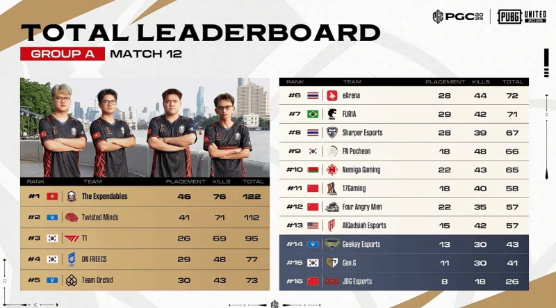 階段6剩余7隊,賽后勢危4AM獨狼被T1炸掉,組小組賽但隨后自己也被NMG淘汰,大G墊底形QAD進(jìn)圈過(guò)程中被DNF打掉多人僅剩1人,優(yōu)勢NMG在藍圈外出局。領(lǐng)跑