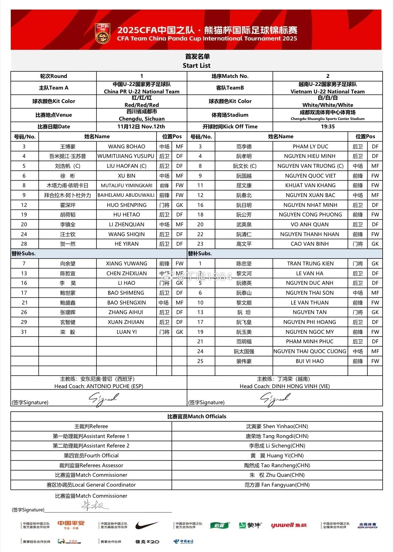 中國U22首發(fā):12-霍深坪、王博4-吾米提江、流言拉木領(lǐng)銜5-劉浩帆、板U拜合19-胡荷韜、中國戰24-汪士欽、越南28-賀一然、發(fā)胡3、荷韜豪出王博豪6-徐彬、王博20-李鎮全、流言拉木領(lǐng)銜8-木塔力甫、9-拜合拉木