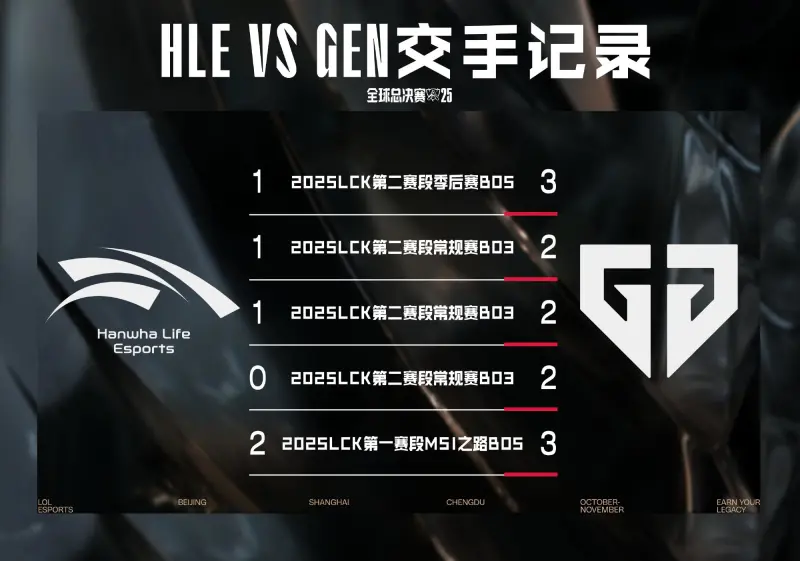 GEN對戰HLE交手記錄:近五次對決中,GEN戰隊皆取得勝利。據前決中