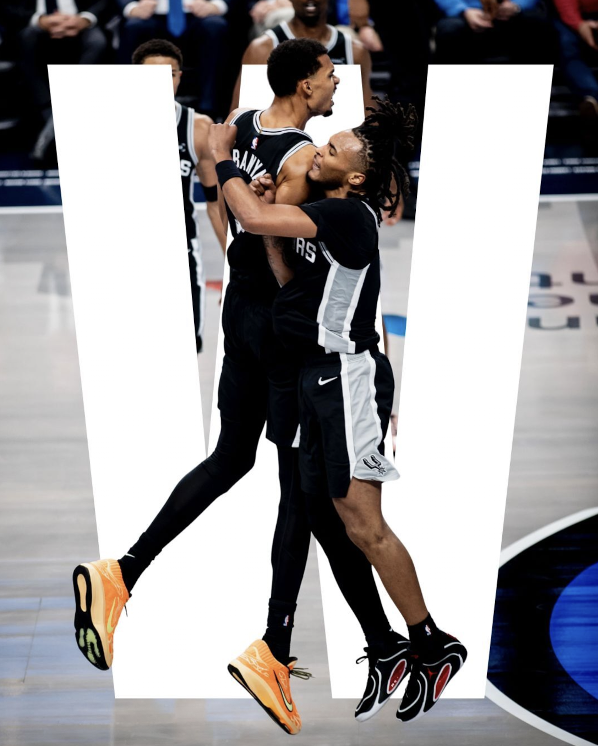 [流言板]拿下比賽!馬刺官媒曬文班亞馬與卡斯爾慶祝照:馬刺獲勝!
