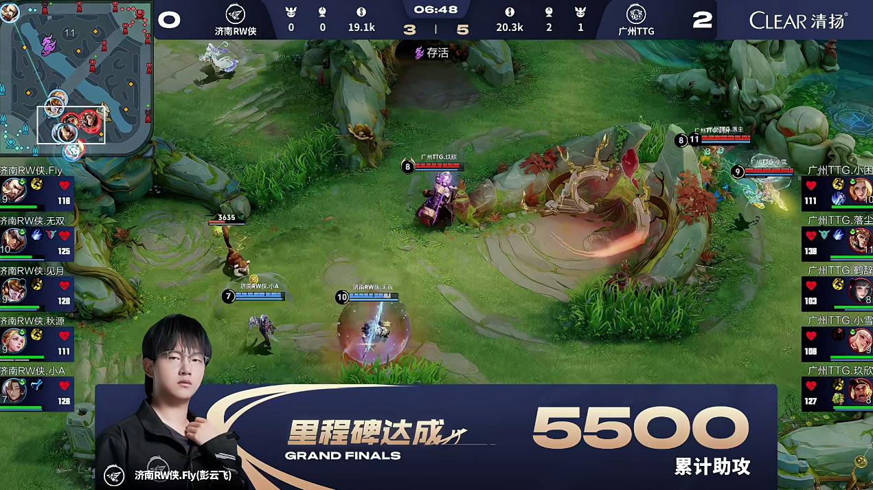 虎撲10月09日訊 2025KPL年度總決賽第10日第3場(chǎng)第3局,濟南RW俠.Fly(彭云飛)達成累計助攻5500里程碑!云飛