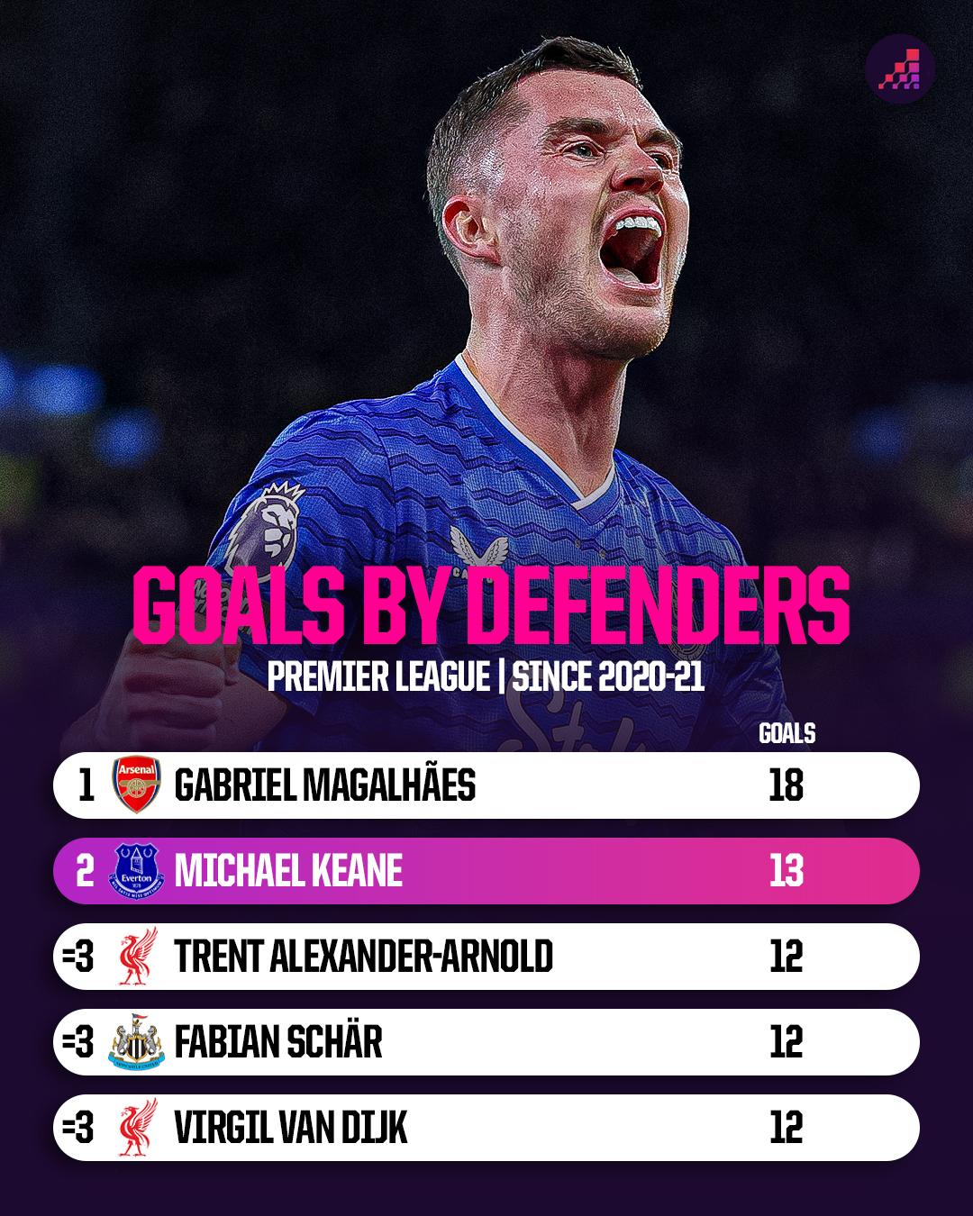 [流言板]自20/21賽季埃弗頓中衛基恩已打入13球,英超后衛僅次于加布