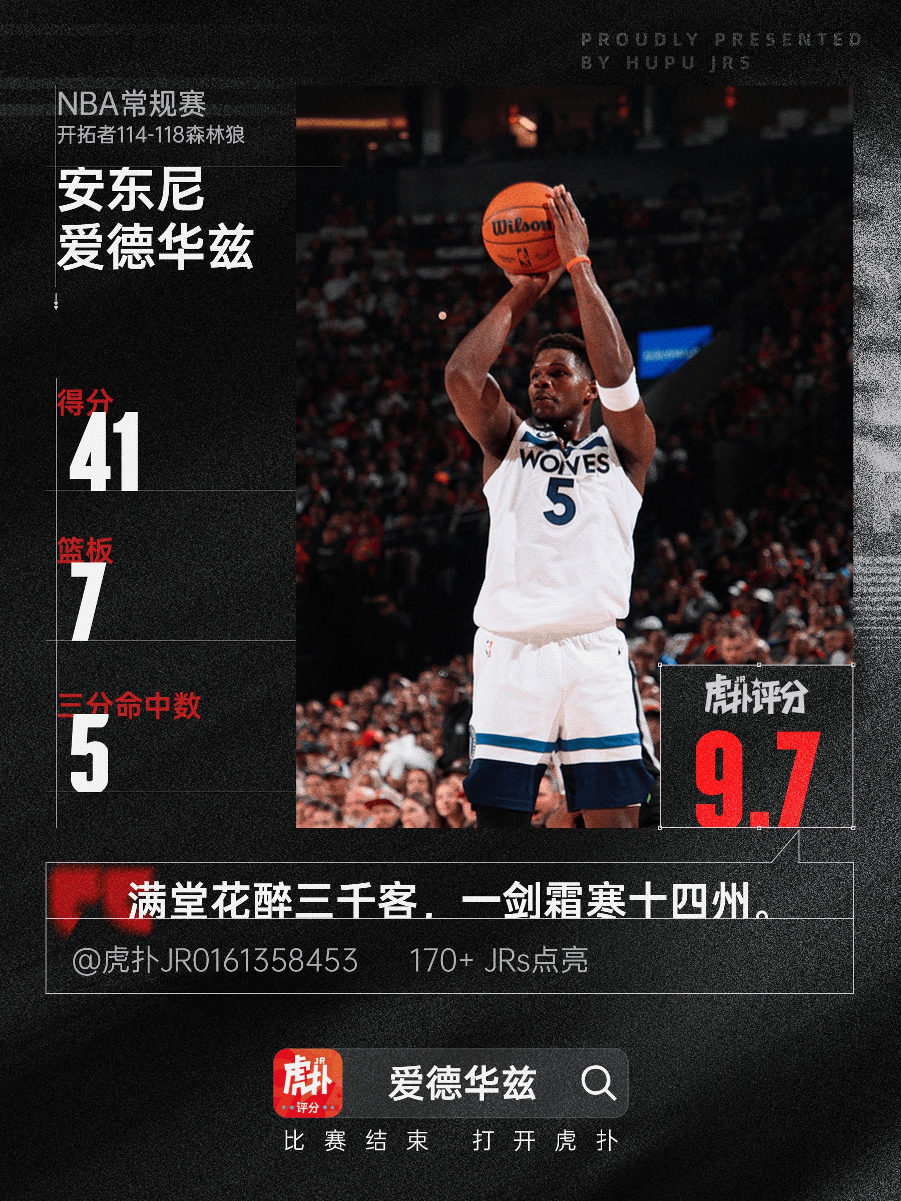 本場(chǎng)比賽,砍下森林狼球員安東尼-愛(ài)德華茲出戰39分鐘,分籃28投14中,其中三分球10投5中,罰球8投8中,得到41分7籃板1助攻1封蓋。