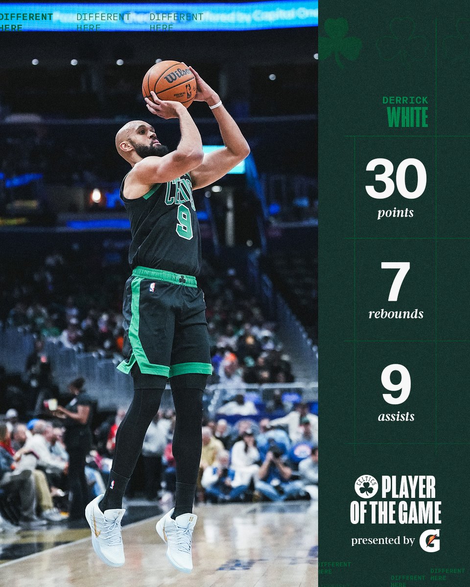 “德里克-懷特本賽季首次砍下30分!29分鐘內砍下30分的德里克-懷特當選為本場(chǎng)最佳球員!”凱爾特人官方附文道。