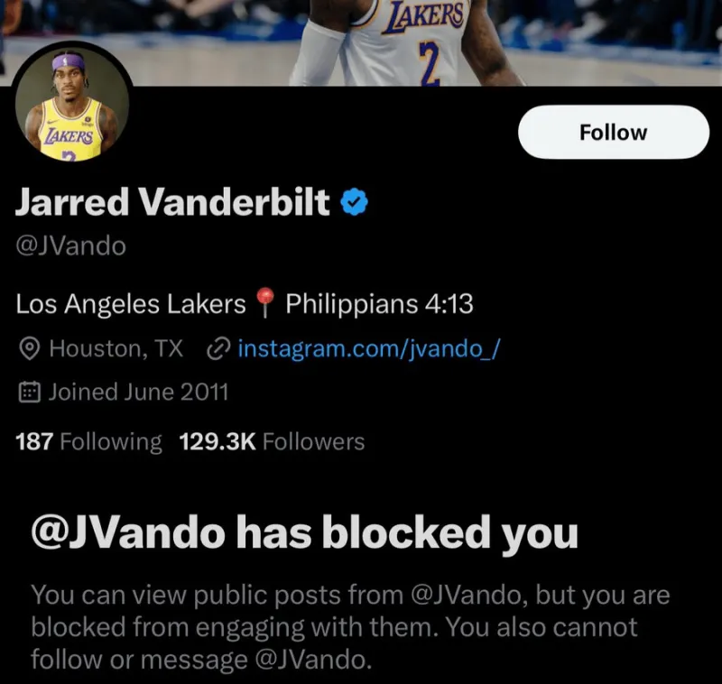 晚些時(shí)候,LakeShowYo再次更新一張圖,上面顯示賈里德-范德比爾特已經(jīng)將其拉黑。