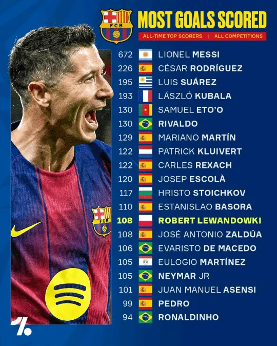 萊萬(wàn)本賽季能不能進(jìn)巴薩歷史射手榜前五