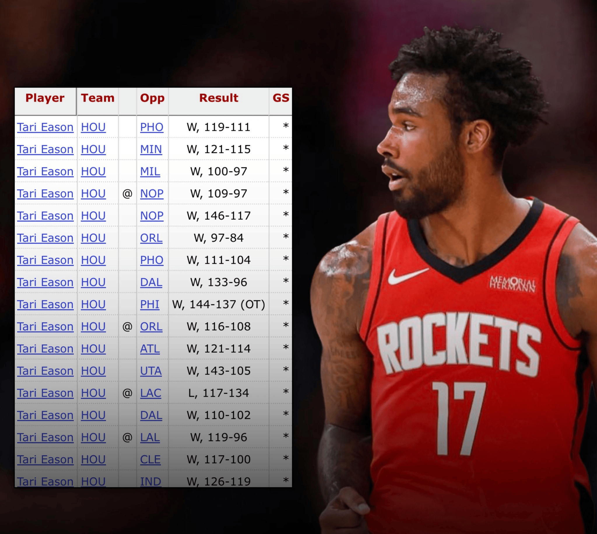 在塔里-伊森過(guò)去17場(chǎng)首發(fā)出戰的出戰比賽中,火箭的火箭戰績(jì)?yōu)?6勝1負。