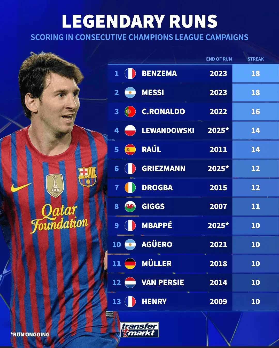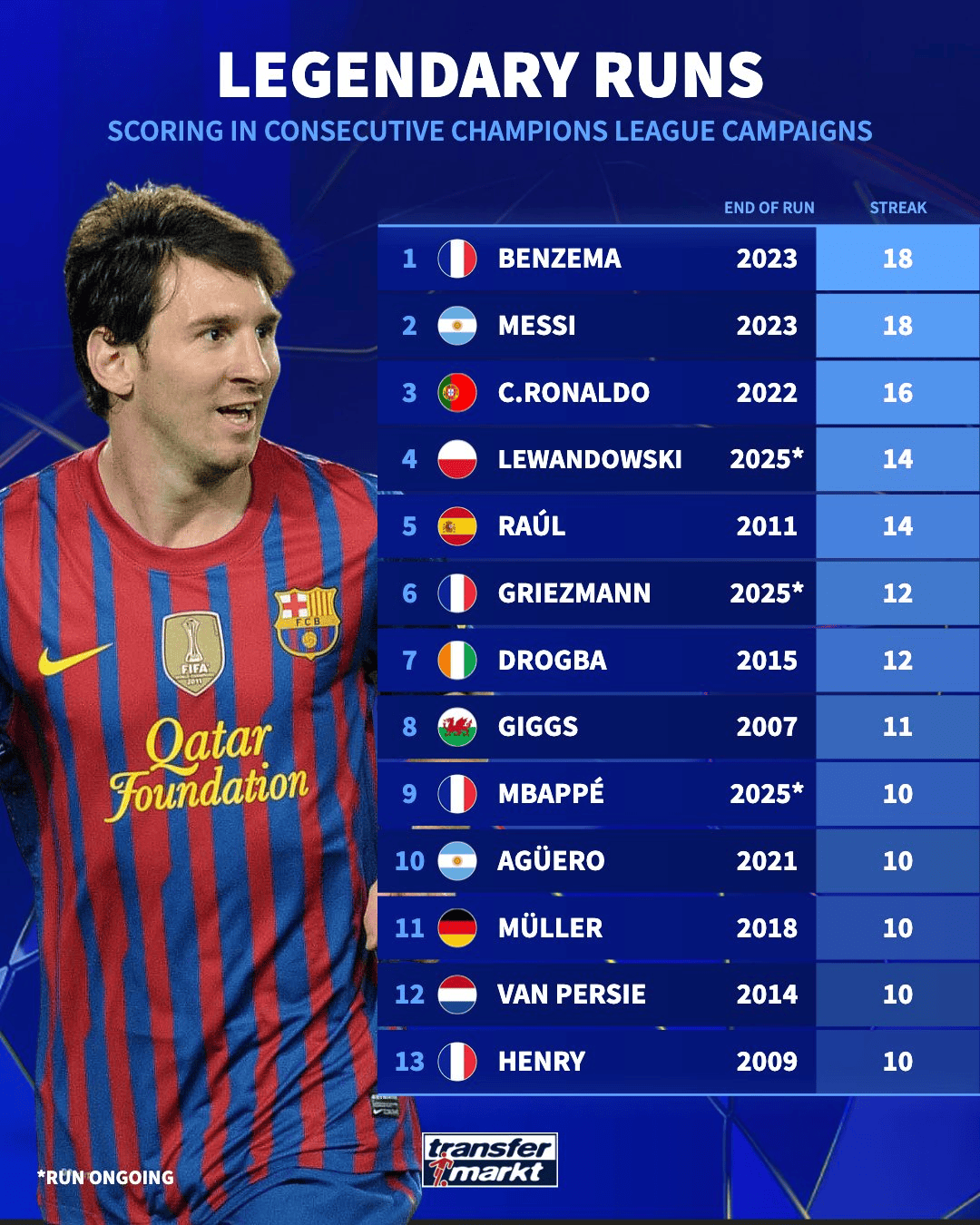 現役球員中,萊萬(wàn)多夫斯基以連續14個(gè)賽季進(jìn)球并列第四。馬競前鋒格列茲曼已連續12個(gè)賽季在歐冠進(jìn)球,巴黎前鋒姆巴佩則已經(jīng)連續10個(gè)賽季取得歐冠進(jìn)球,三人的紀錄仍在延續。