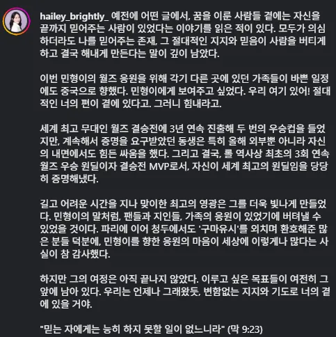 這次為了支持珉炯的全球總決賽,分散在各地的家人即使行程繁忙也依然奔赴中國。我們想讓他知道,我們在這里!你絕對的依靠就在身邊。所以,請加油。