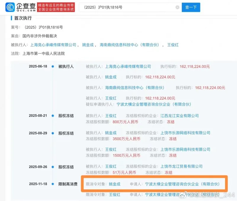 此前,姚金成、上海競心承峰傳媒有限公司等已因此案被強制執行1.6億,姚金成所持RNG(上饒市樂(lè )游網(wǎng)絡(luò )科技有限公司)3500萬(wàn)股權被凍結。