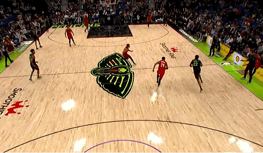 第二節比賽中,過(guò)人奎因后場(chǎng)背運過(guò)人一條龍持球推進(jìn),條龍推進(jìn)再頂著(zhù)兩人強硬上籃打進(jìn)。持球