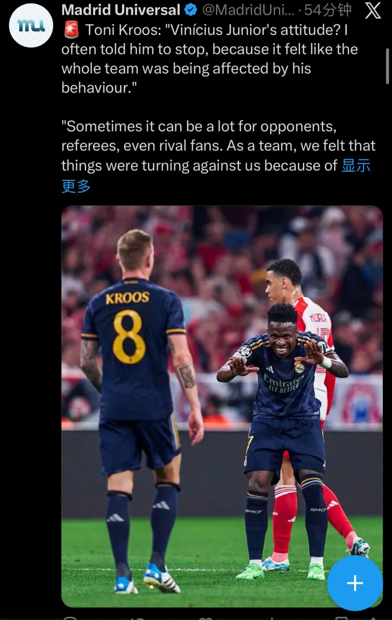 ????皇馬傳奇克羅斯:“我一直跟維尼修斯說(shuō)別再這么做了,因為能明顯感覺(jué)到,大家都在因他的言行受影響。他有時(shí)候讓別人不喜歡,這是可以理解的,不管是對對手、裁判,還是客場(chǎng)球迷。作為團隊,你就會(huì )覺(jué)得,就因為圍繞他發(fā)生的這些事,所有壓力都轉向了我們整個(gè)團隊。