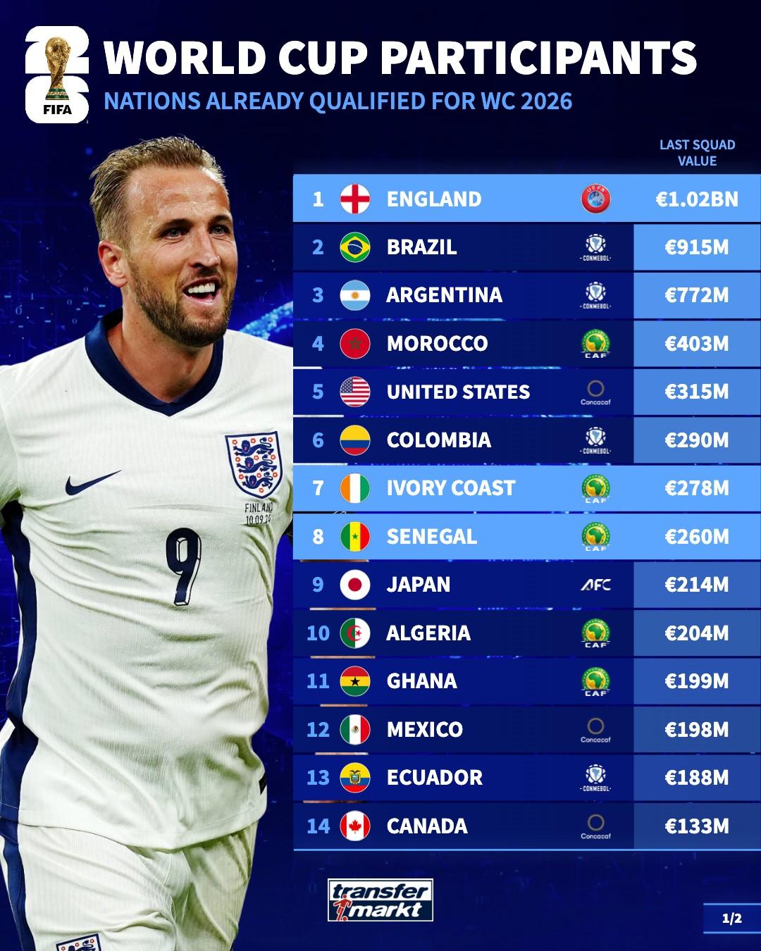 據德國轉會(huì )市場(chǎng)統計,截至目前共有28支國家隊確定進(jìn)入2026世界杯決賽圈,其總身價(jià)排名(歐元)如下: