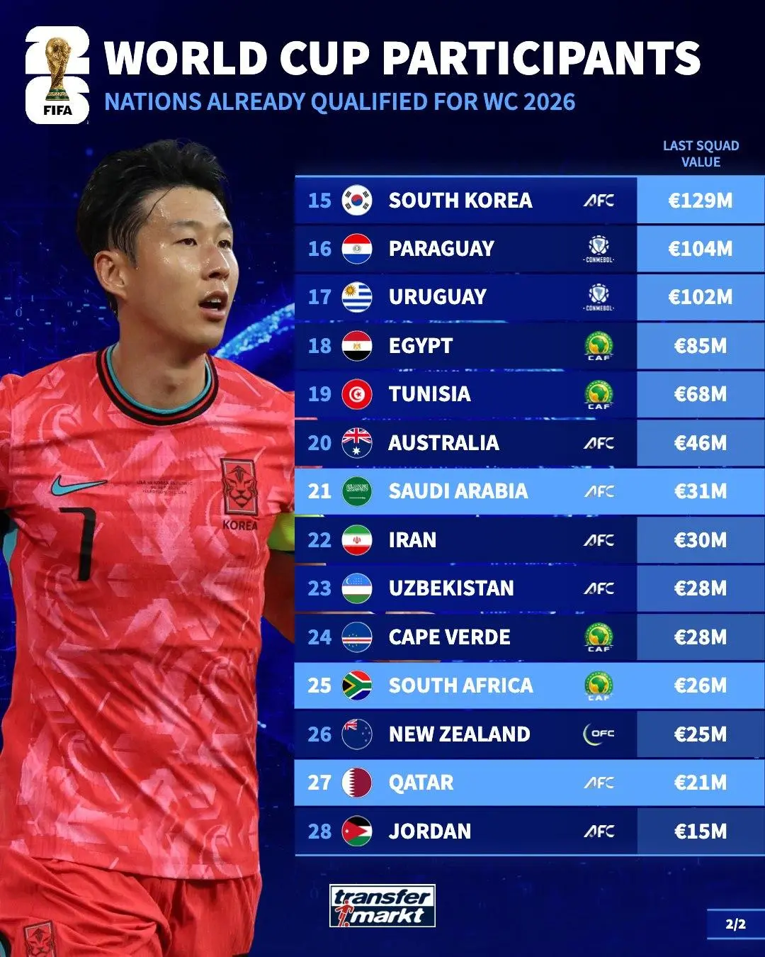 據德國轉會(huì )市場(chǎng)統計,晉級價(jià)榜緊隨截至目前共有28支國家隊確定進(jìn)入2026世界杯決賽圈,世界雙雄其總身價(jià)排名(歐元)如下: