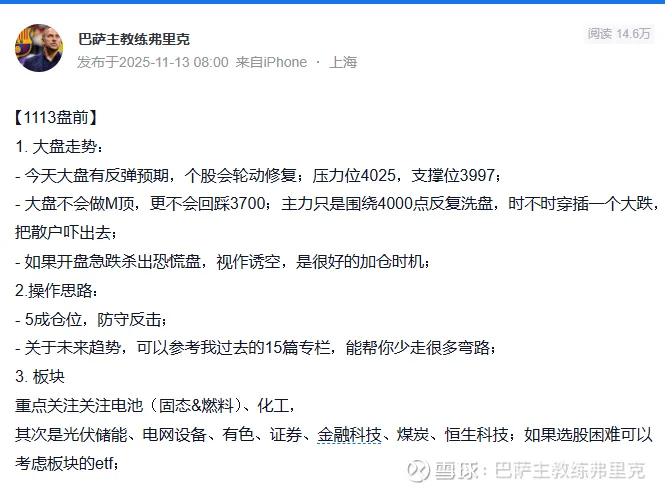今天這種大漲算是符合甚至超出盤(pán)前的預期,可惜開(kāi)盤(pán)下殺的時(shí)候,我還在電梯里,沒(méi)法抄底做個(gè)T;不過(guò)從技術(shù)結構和昨天下午汪汪隊的動(dòng)作來(lái)看,我對今天的大盤(pán)非常有信心;早上有人問(wèn)支撐位3997是不是寫(xiě)錯了,當然沒(méi)有寫(xiě)錯,大盤(pán)跌破了一下支撐位也只是為了誘空而已;