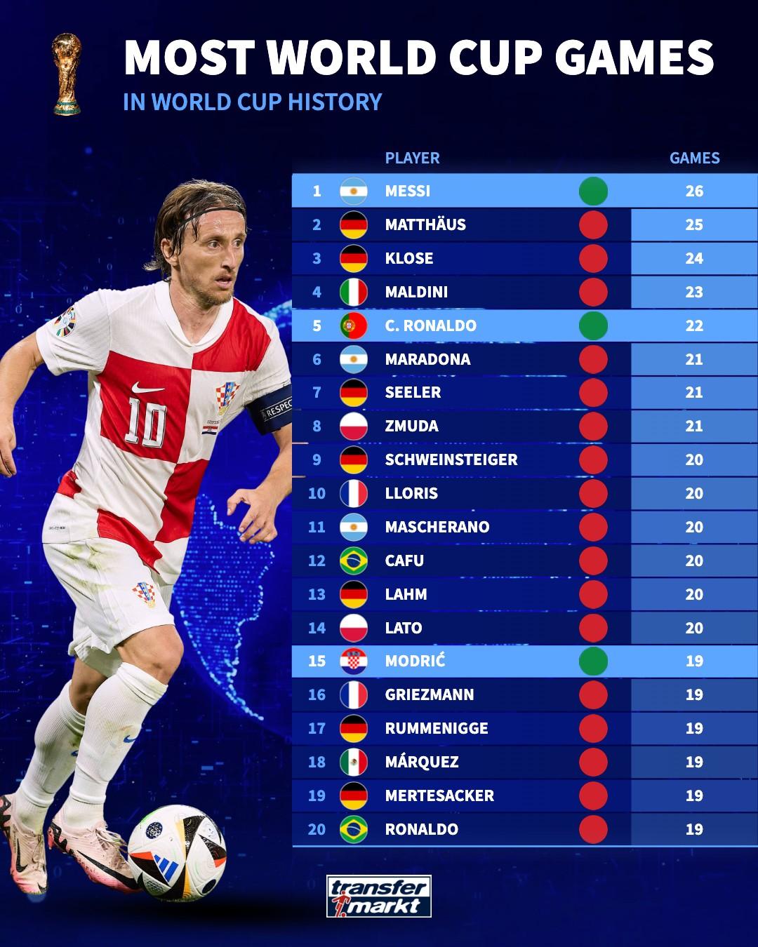 [流言板]世界杯歷史出場(chǎng)榜:梅西26場(chǎng)居首,C羅第5,莫德里奇第15