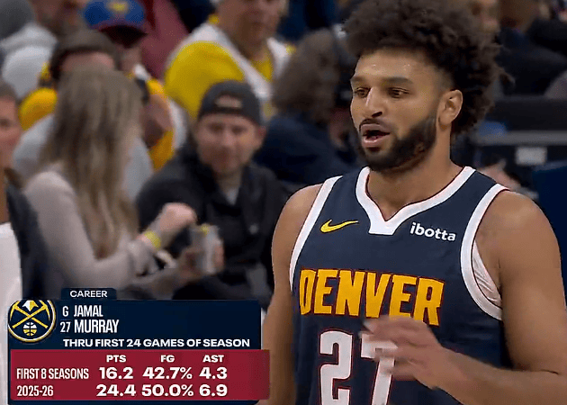 比賽的默里第三節,轉播畫(huà)面給出一組數據,本賽比內容為掘金球員賈馬爾-默里生涯多項數據的季前季對均明對比,詳情如下: